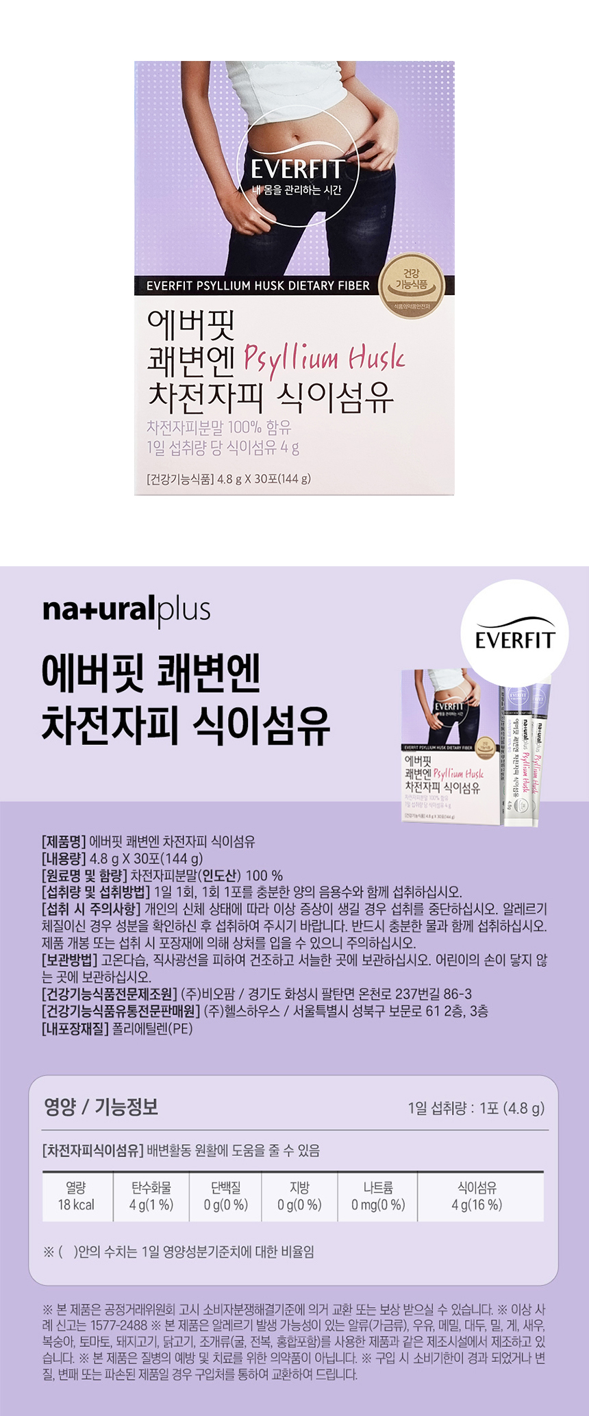 내츄럴플러스 에버핏 쾌변엔 차전자피 식이섬유 4.8g x 30포