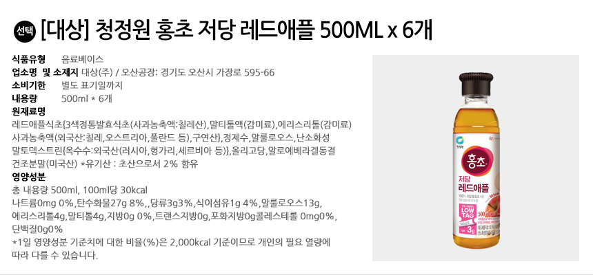 대상 청정원 홍초 저당 레드애플 500ML x 6개