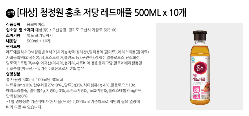 대상 청정원 홍초 저당 레드애플 500ML x 10개
