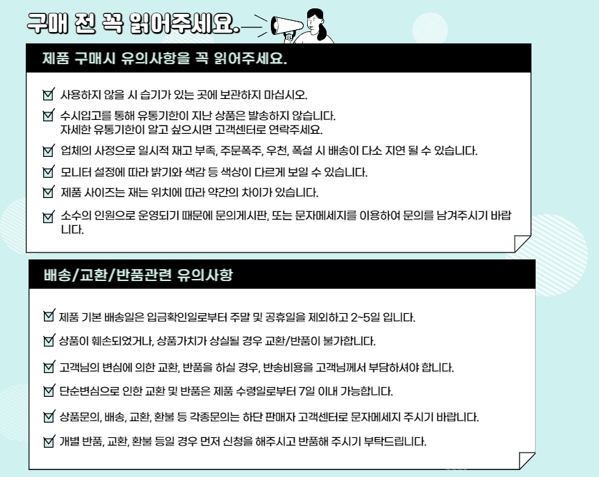 반품/교환에 관한 일반적인 사항은 판매자 제시사항보다 관계법령이 우선합니다.