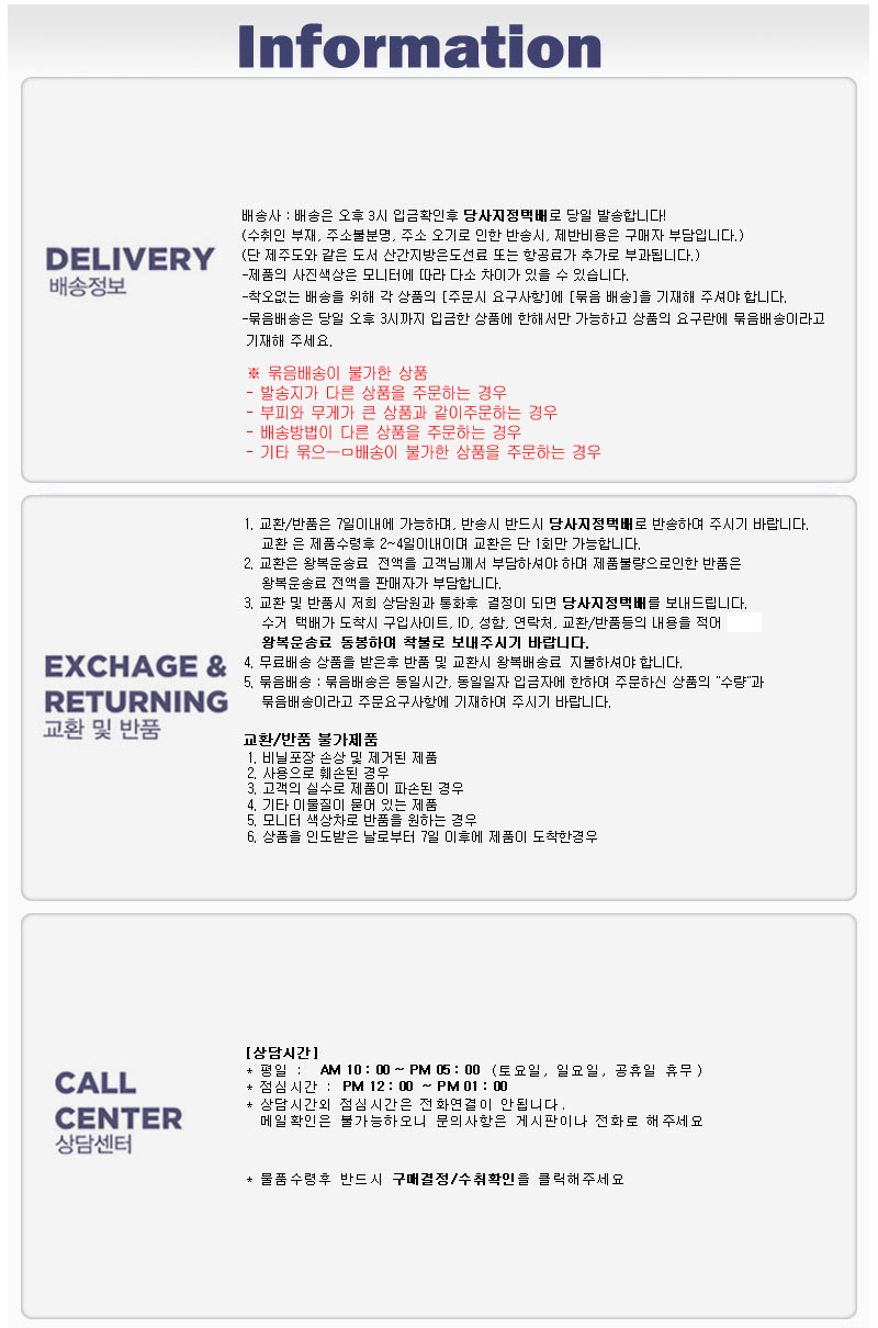반품/교환에 관한 일반적인 사항은 판매자 제시사항보다 관계법령이 우선합니다.