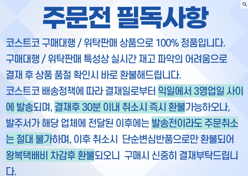 반품/교환에 관한 일반적인 사항은 판매자 제시사항보다 관계법령이 우선합니다.